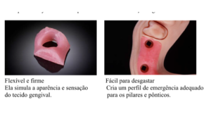 Máscara gengival flexível e firme que simula a aparência e sensação do tecido gengival.