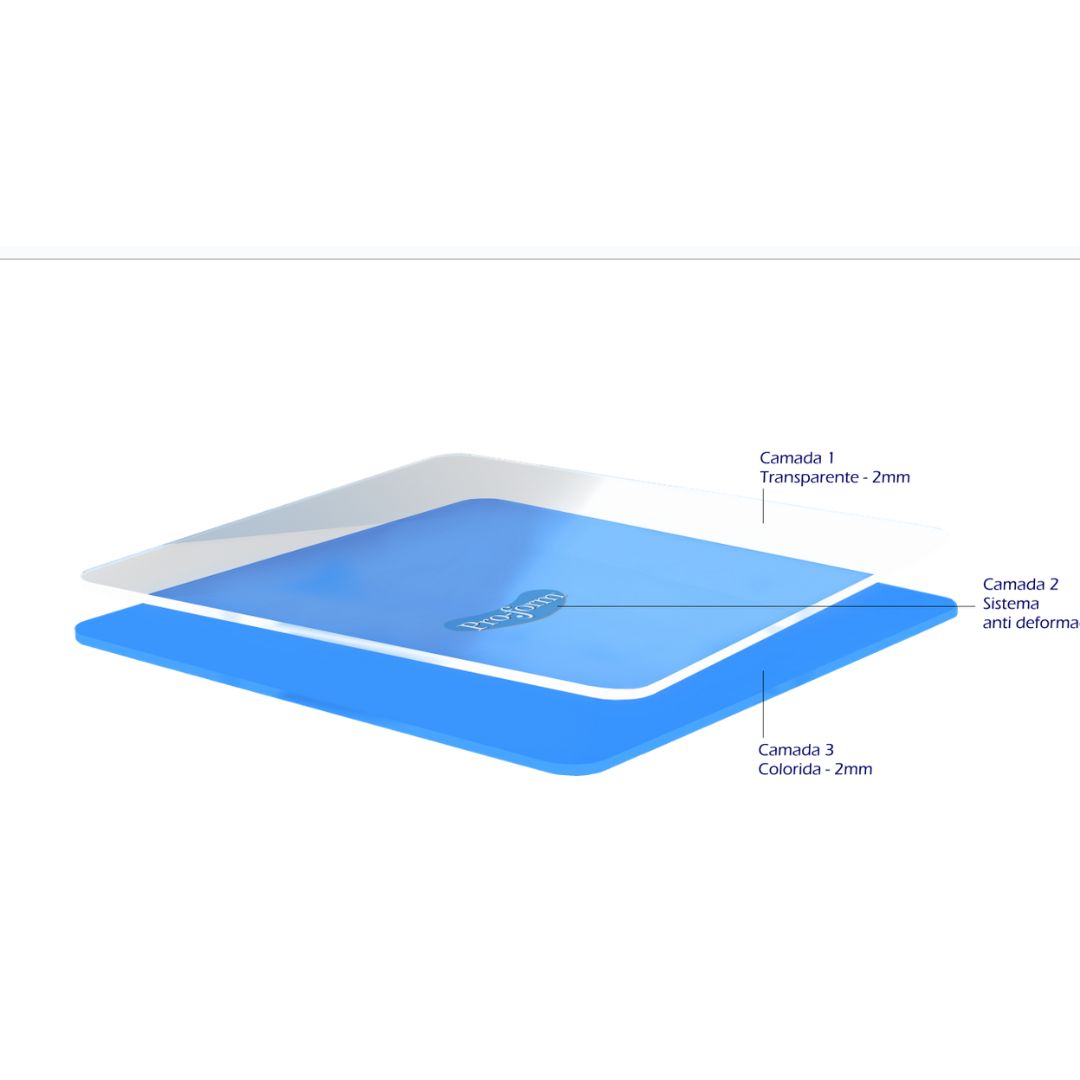 As lâminas Pro-Form® apresentam uma grande durabilidade e como já vêm com duas camadas de 2mm (uma colorida e outra transparente) fundidas não sofrem delaminação e com a tecnologia Pro-Form® foi possível incorporar uma terceira camada de proteção no interior da lâmina. A logo ProForm que está no centro da lâmina não é apenas uma forma de diferenciar a marca do material, este componente é na verdade uma terceira camada de proteção confeccionada em um material diferente do EVA que confere uma resistência maior à deformação da placa frente ao impacto. Proteção de verdade só com as lâminas Pro-Form® da Keystone.