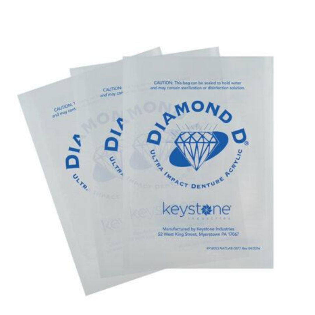 O pacote plástico Mylar Pouch Diamond D é a forma mais segura para enviar a prótese confeccionada em resina Diamond D para seu cliente, e também é uma maneira de se mostrar ao cliente que o trabalho protético que ele está recebendo foi confeccionado com a resina mais resistente e segura do mundo. Além de higiênico é um elemento de marketing de seu laboratório ou consultório.